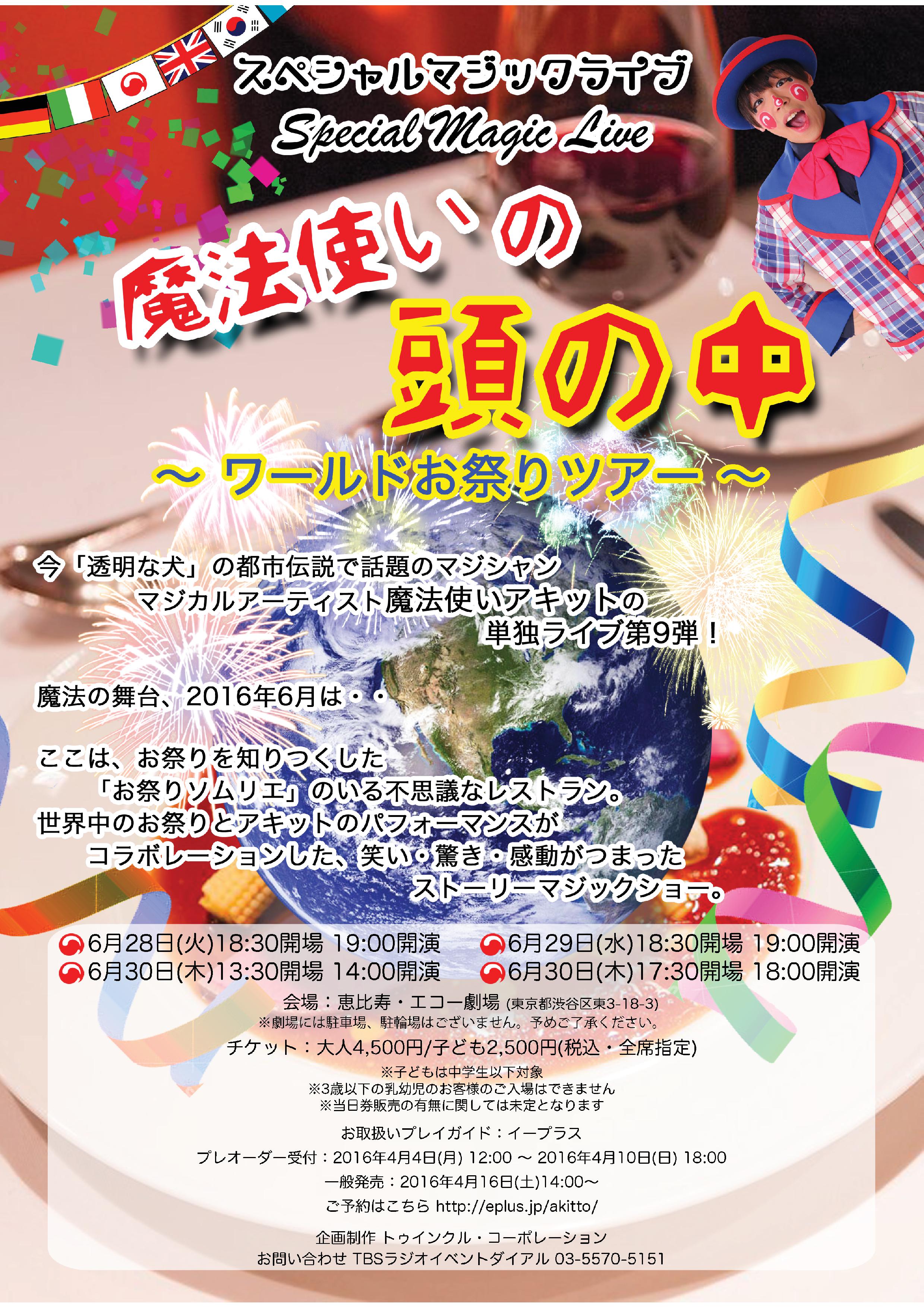 マジカルアーティスト魔法使いアキットの単独ライブ第9弾! 魔法の舞台、2016年6月は・・ ここは、お祭りを知りつくした「お祭りソムリエ」のいる不思議なレストラン。 世界中のお祭りとアキットのパフォーマンスがコラボレーションした、 笑い・驚き・感動がつまったストーリーマジックショー。 お子様からお年寄りまでお楽しみいただけます。 |