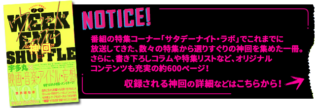 サタデーナイトLabo 週替わりの特集コーナー。 ゲストを迎えたり、曲を徹底的に解説したり、時には実験的な企画も...番組のメインディッシュ的コンテンツ。